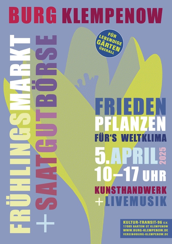 Tausche Pflanze! Wir laden zum Austausch von selbstgezogenem Saatgut, Pflanzen, Kräutern und Stauden ein. Es gibt Kunsthandwerk und Angebote von Gärtnereien aus der Region. Insektenvielfalt für Blüten und Vögel, pestizitfreie Landschaften für Menschen und Tiere – dafür stehen auch »Natur im Garten«, »Die Saatgutkampagne«, der VLA – MV und viele andere. Dazu Musik – „IrreMurxx“ in Frühlingsluft, Mitmachaktionen für Kinder, Kaffee und kleine Köstlichkeiten.