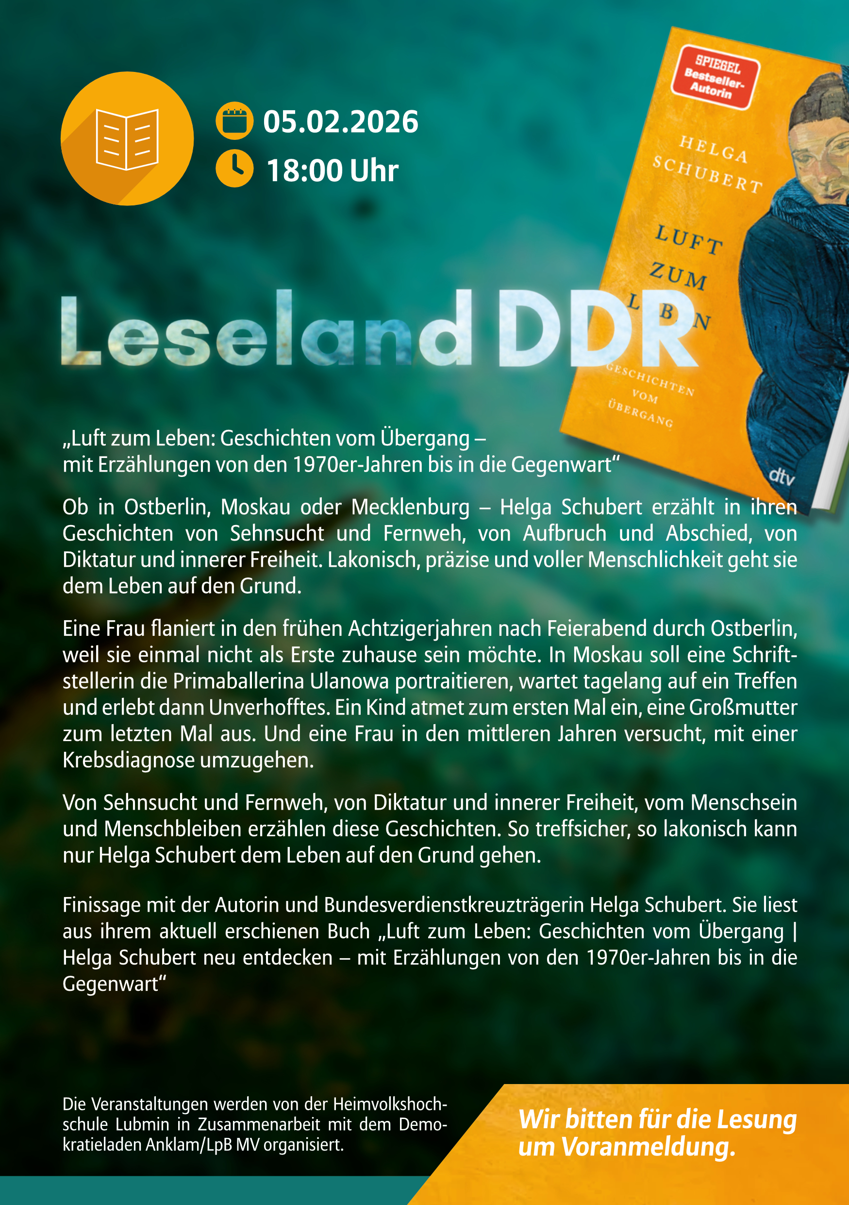 Um Voranmeldung wird gebeten: E-Mail: info@heimvolkshochschule; Tel: 03354-22215