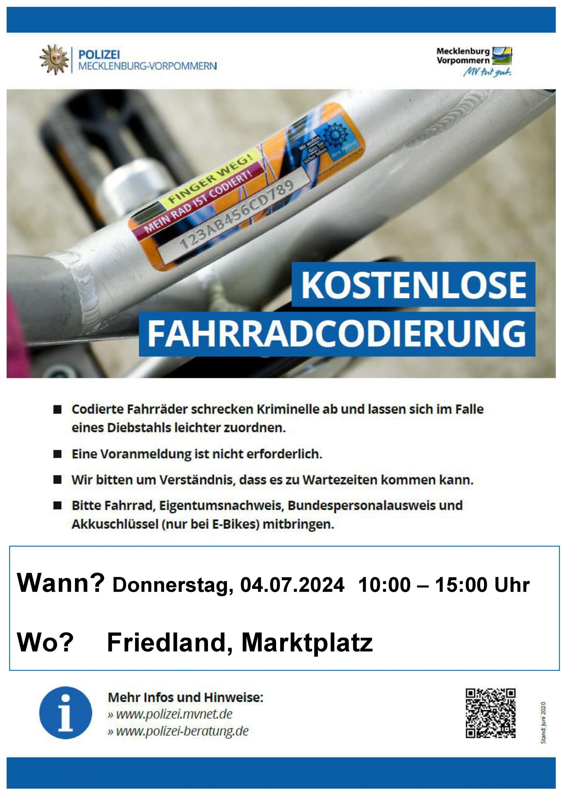 Interessierte sind herzlich eingeladen, ihr Rad codieren zu lassen. Alles, was für die Fahrradcodierung benötigt wird, ist ein gültiger Personalausweis sowie das Fahrrad. Minderjährige sollten in Begleitung ihrer Eltern erscheinen oder sich eine entsprechende Vollmacht ausstellen lassen. Sollte es sich bei dem zu codierenden Fahrrad um ein E-Bike handeln, wird darum gebeten, den Akku bereits…